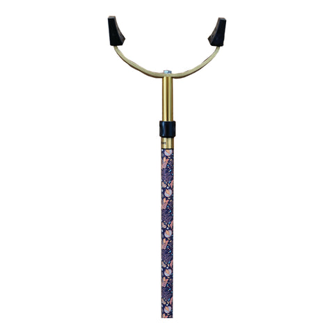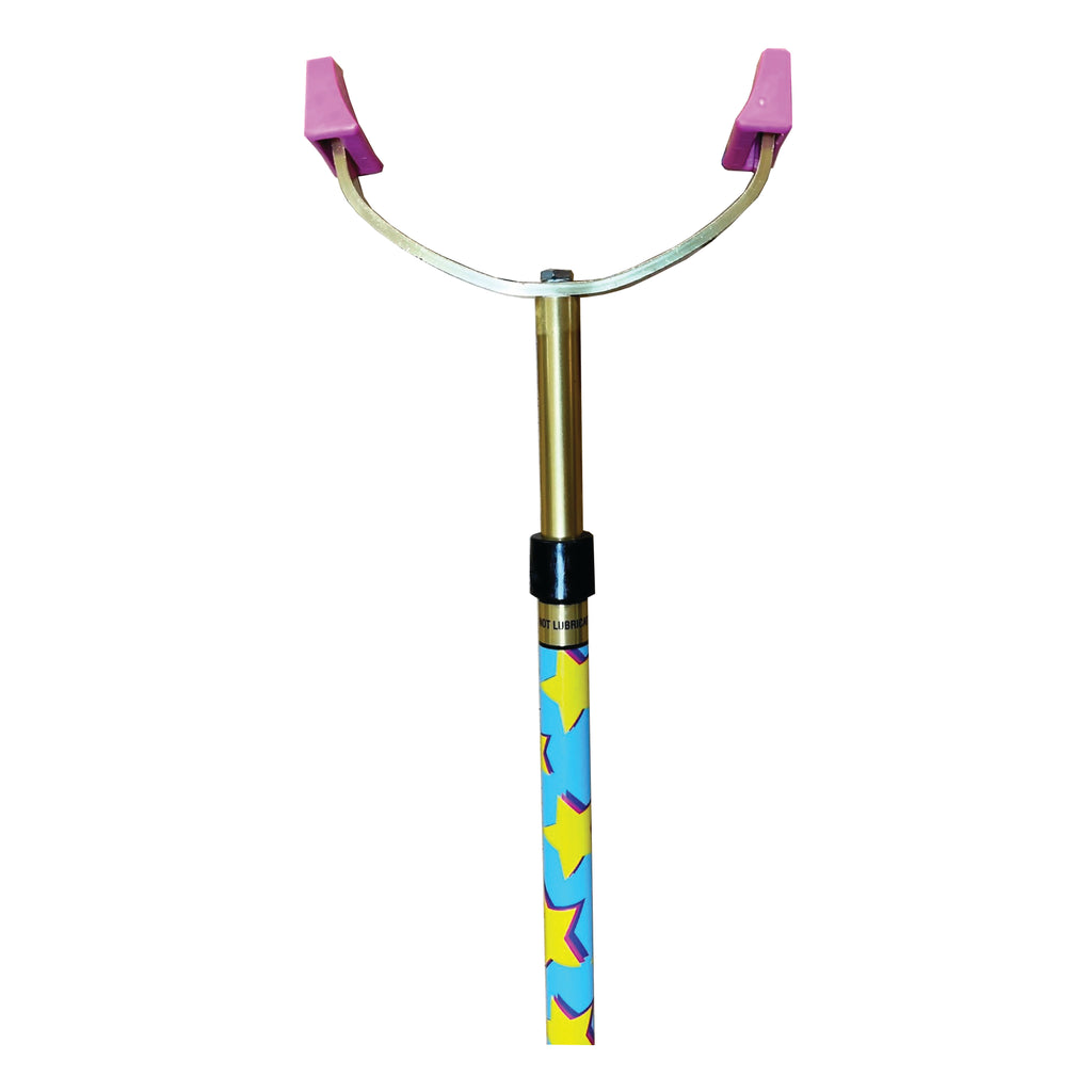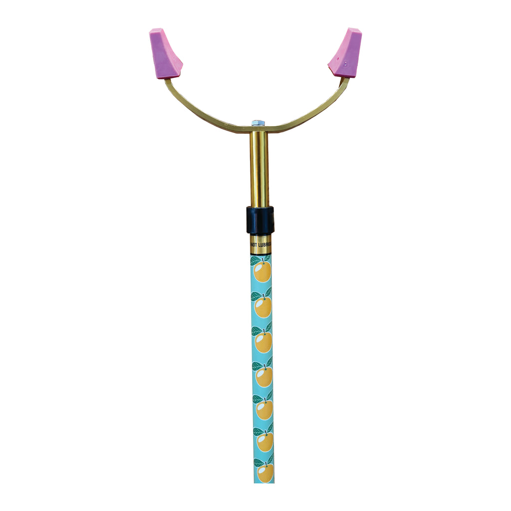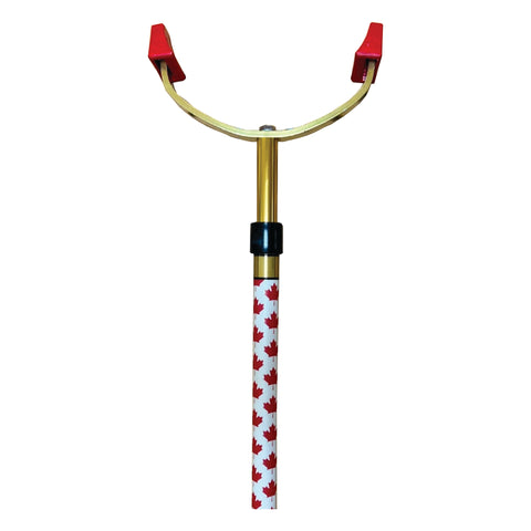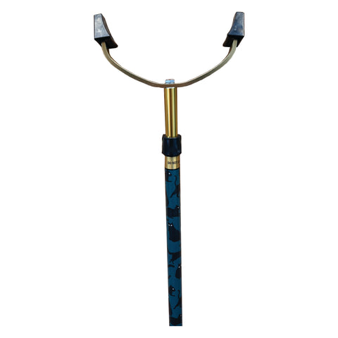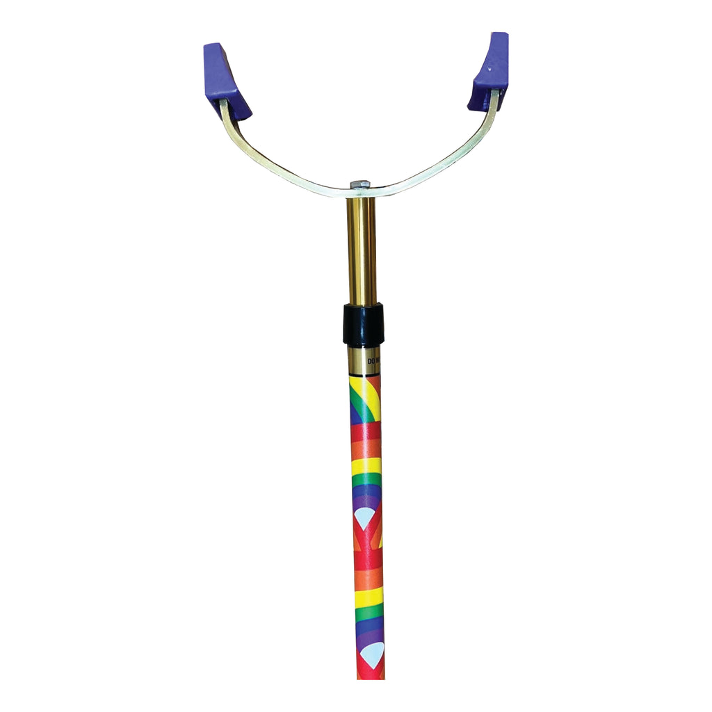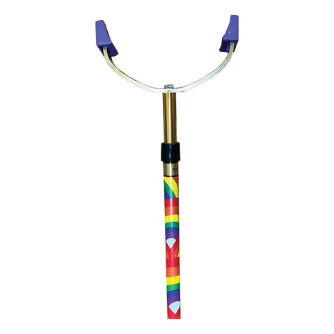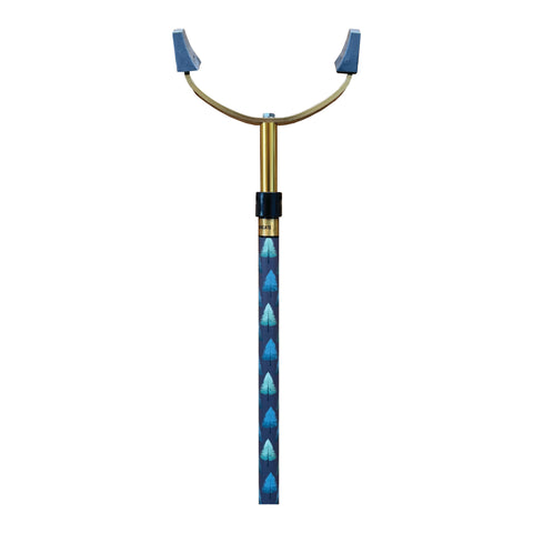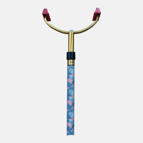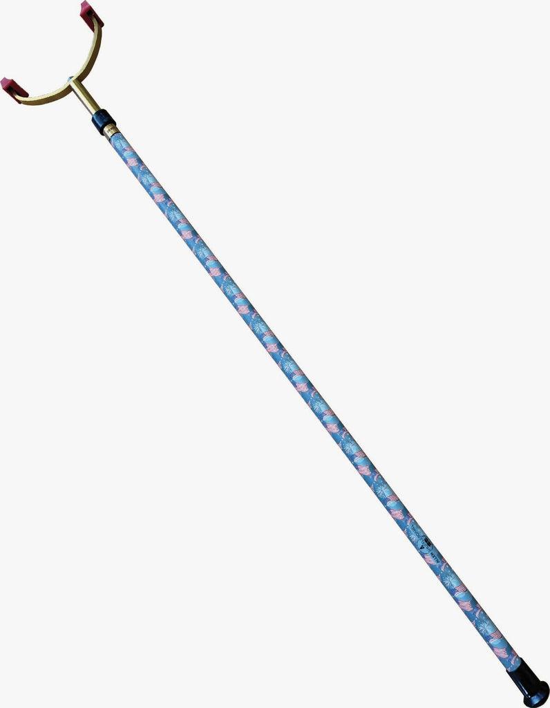 This limited-design wrapped cue is a durable, decorative vinyl. It is a regulation-sized, telescoping aluminum cue with a replaceable 5 1/2W head. The Big Foot Runners on this cue are designed to curve around the sides of the shuffleboard disc to offer additional control. This cue collapses to approximately 43" for easy storage. The locking mechanism makes it easy to adjust the cue to be shorter than the regulation length, which is great for kids and shorter adults.
